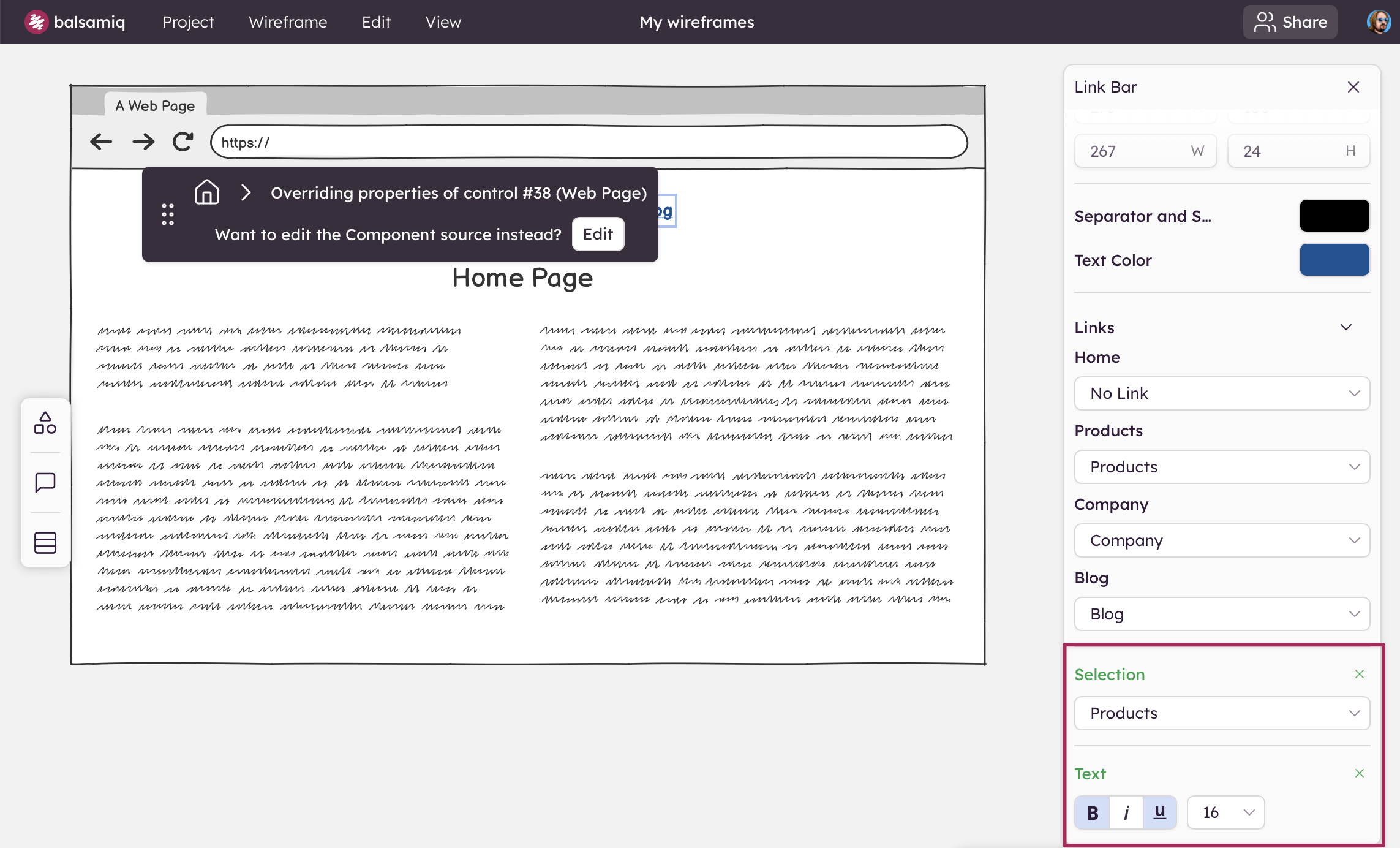 At this point, you can manipulate each UI element inside the Components at will, as if you were editing a group. Some operations are not permitted while overriding Component properties, such as adding, deleting or grouping UI elements. If, instead, you want to edit all instances of the Component, click the "Edit" button.